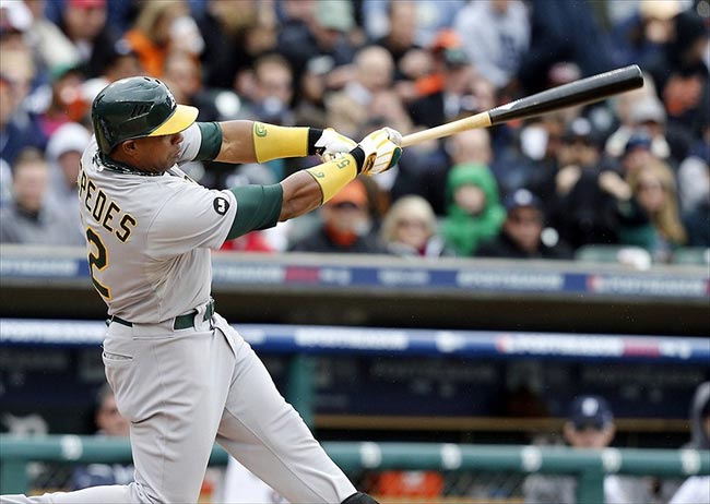 Oct 7, 2012; Detroit, MI, USA; Oakland Athletics left fielder Yoenis Cespedes (52) hits an RBI single against the Detroit Tigers during the third inning of game two of the 2012 ALDS at Comerica Park. Photo Credit: Rick Osentoski-USA TODAY Sports.